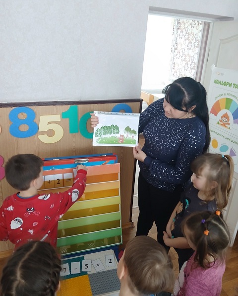 Діти опрацьовували склад числа, кількісну та порядкову лічбу; пряму і зворотну лічбу; навчалися розв’язувати віршовані задачі; розвивати логічне мислення, активність, зорову і слухову пам’ять, активне мовлення; учили узгоджувати числівники з іменниками під час відповідей на запитання “Який?”, “Скільки?”; розвивати просторову уяву, дрібну моторику.